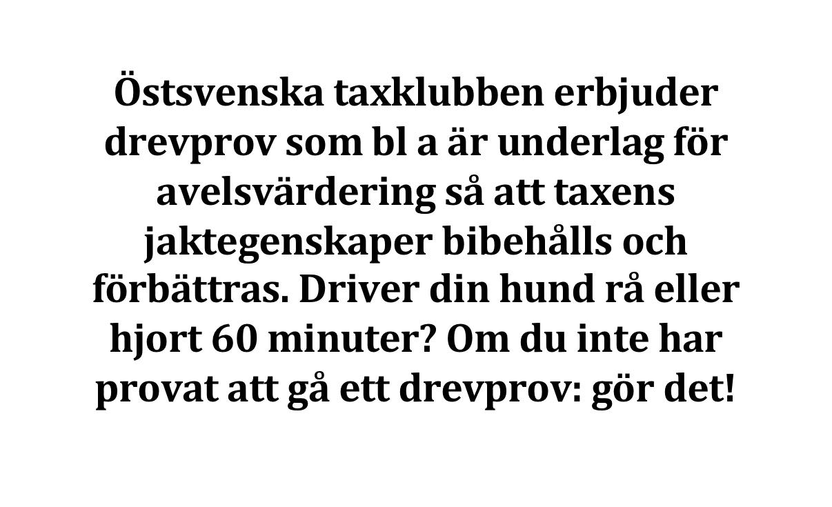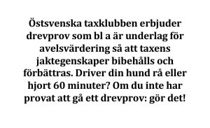 En härlig söndag med försmak på drevjaktspremiären! Östvenska Taxklubben har idag hållit en drevdomarkonferens hemma hos vår drevdomare Anna Löfgren i Heby. Tre taxar: Asta, Astor och Mariebergs Ädda släpptes, med länsstyrelsens tillstånd, för efterföljande gemensam bedömning av klubbens domare. Denna typ av domarkonferenser är viktiga för att få en enhetlig och rättvis bedömning vid drevproven och genomförs årligen av de flesta taxklubbarna.